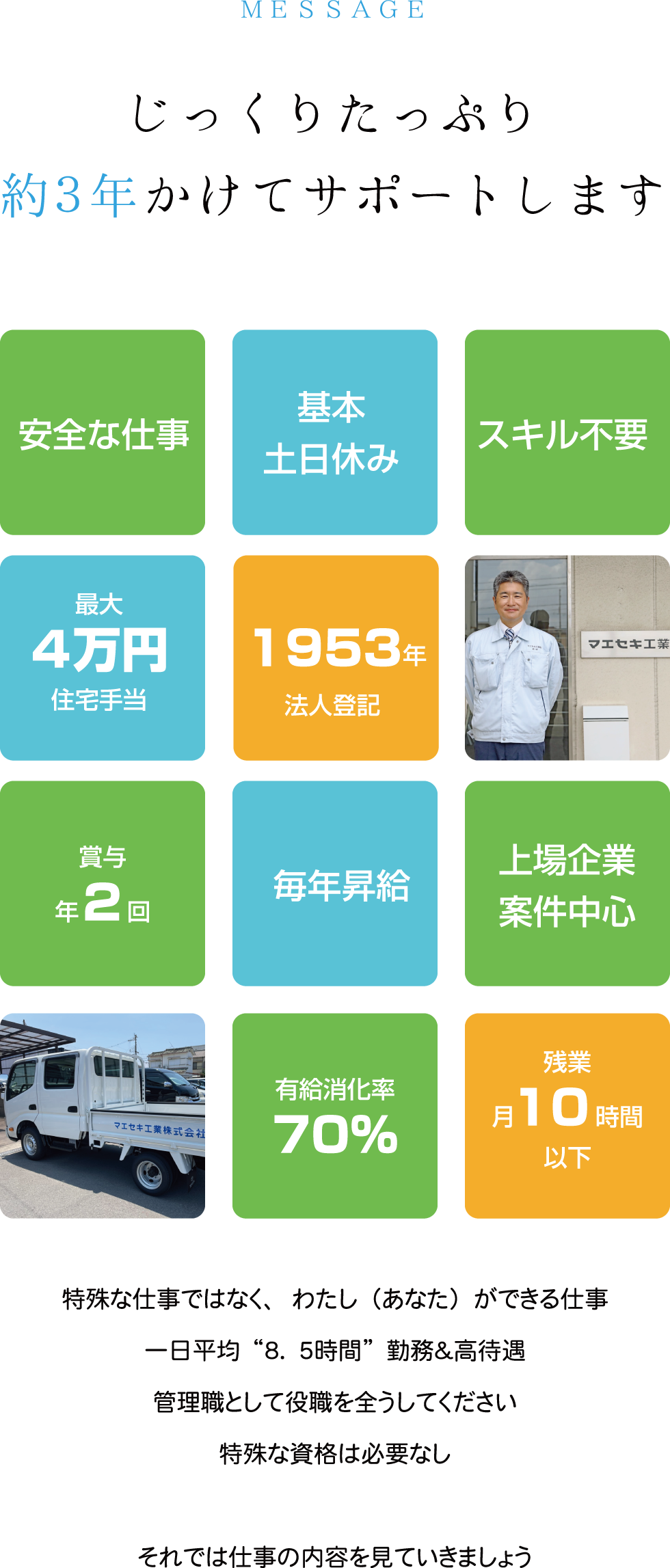 入社8年目。30半ばで全く違う職種から転職ということもあり、最初は戸惑いもありましたが、お客様の依頼を聞き、協力会社と共に一つの現場を納めていく今の仕事にやりがいを感じています。年齢を重ねてからの転職では不安はおおきいかと思いますが、経験がなくても、先輩・同僚のフォローもあり、問題ありません。是非一緒に働きましょう。