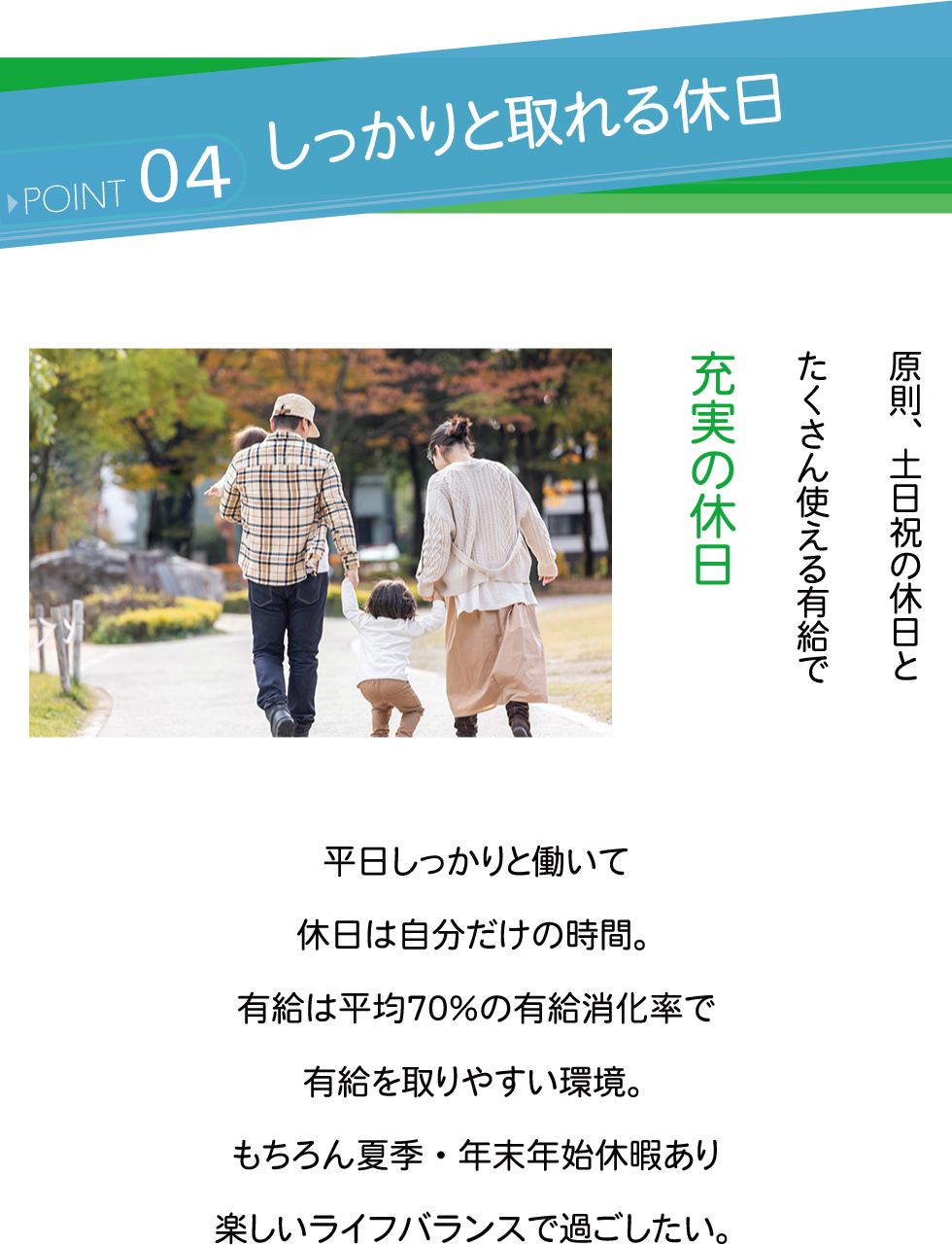 週休2日(月1度土曜日出勤)、GW、夏季(お盆)、年末年始、有給休暇